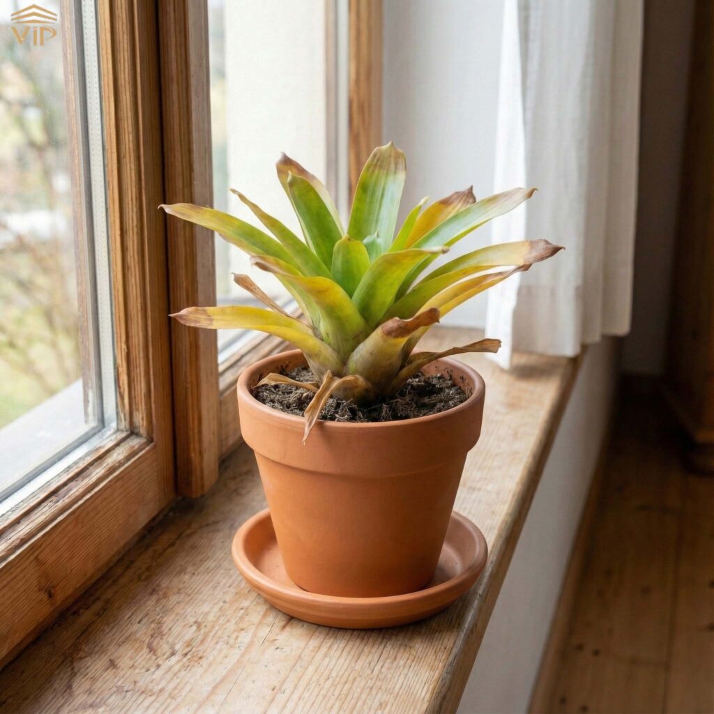 - آبیاری زیاد : اگر خاک یا مرکز برگها (حفره مرکزی که به عنوان مخزن آب عمل میکند) همیشه مرطوب بماند ، ریشهها اکسیژن دریافت نمیکنند و پوسیده میشوند. این امر باعث خفگی ریشه و زرد شدن برگها از پایین به بالا میگردد.