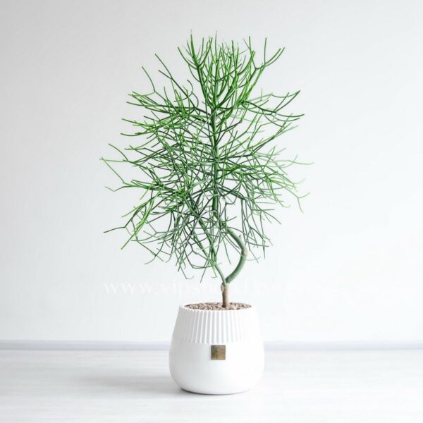 ساقههای درخشان در گلدان آپارتمانی افوربیا تیروکالی متوسط، با وقاری کم نظیر گرد هم آمده اند و آماده فرحبخشی به فضای شما هستند.