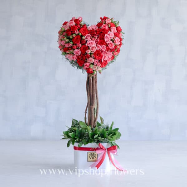باکس گل درختی رز قرمز طرح قلب که ترکیب رنگ قرمز و صورتی آن جلوهای زیبا و شیک ایجاد کرده است، هدیهای خاص و فانتزی برای محبوب شماست.