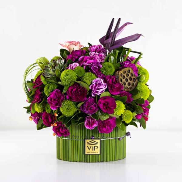 این جعبه گل رز میخک و ساکولنت دارای 1 شاخه گل رز هلندی صورتی، 2 شاخه گل آنتریوم بنفش، 20 شاخه گل میخک، 10 شاخه گل داوودی به همراه برگ و تزیینات لازم تزیین می گردد که یک انتخاب عالی برای افراد مختلف میباشد.