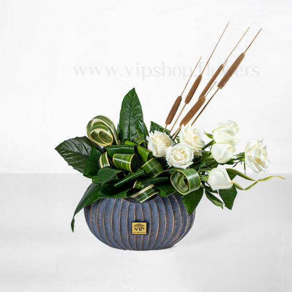 رز هلندی، یکی از محبوبترین و ماندگارترین گلها در میان گیاهان زینتی است و در هر باکس گلی که قرار گیرد، جلوهای دو چندان به آن میبخشد. ترکیب خلاقانه رزهای سفید و برگهای سبز تزیینی در یک باکس چوبی، چشم اندازی دلپسند، جذاب و لاکچری به این محصول داده است.