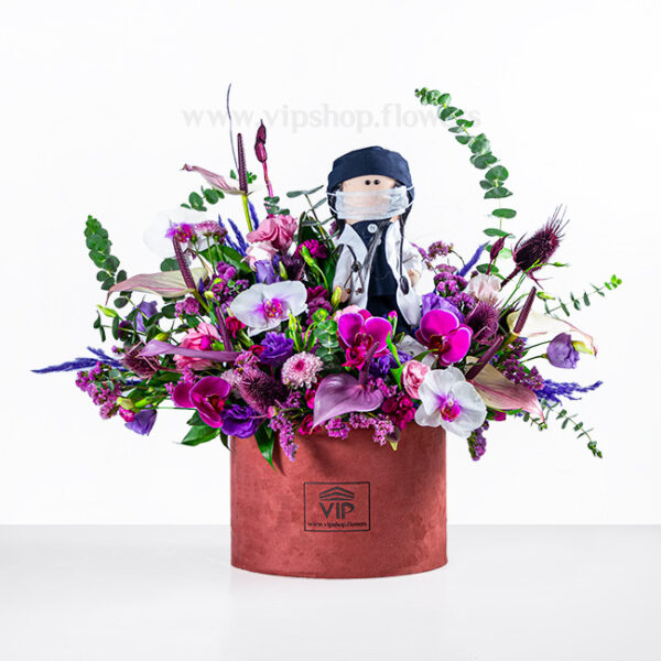 گلهای لطیف و خوش رنگ در باکس مخملی زرشکی، به زیباترین شکل ممکن در کنار یکدیگر قرار گرفته اند. وجود یک عروسک روسی دکتر در میان گلهای خوش عطر و مسحور کننده، ترکیب بی نظیری را خلق کرده و جذابیتی دو چندان به این محصول بخشیده است.