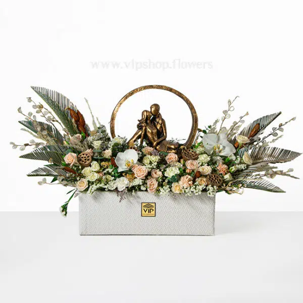 مجسمه دو عاشق که در دل گلهای شاداب و برگهای سبز به آغوش هم پناه برده اند، نمایانگر یک پیوند عمیق و عشق بی قید و شرط است. این جعبه گل، خاطرات زیبا و بی بدیل را تا همیشه، درون خود محبوس کرده و قدرتی برای ادامه مسیر عشق را در وجود ما بیدار میسازد.
