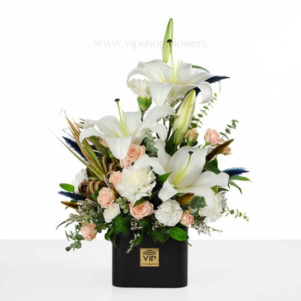 جعبه گل لیلیوم سفید با رز مینیاتوری