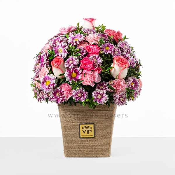 - جعبه گل کنفی رز داوودی که دارای گل رز، گل داوودی و گل میخک می باشد.