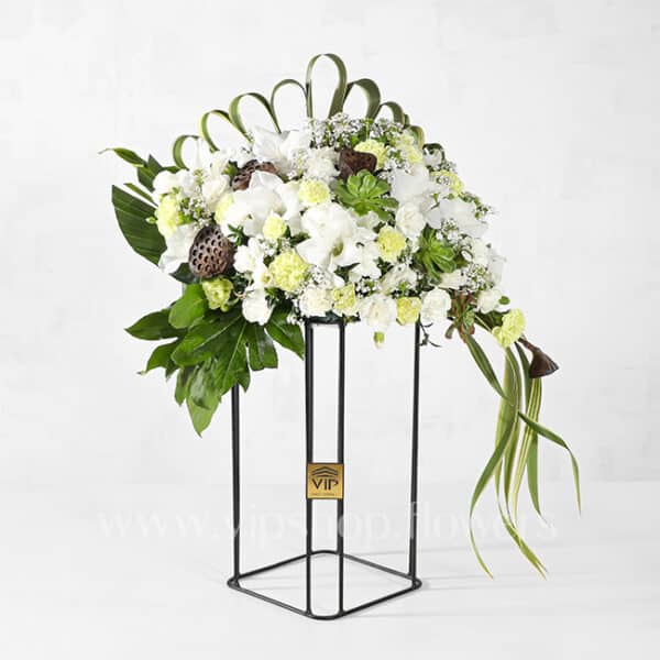 گل ترحیم و تسلیت لوکس پایه فلزی آفتابگردان و متفاوت با تم رنگی سفید با تزیین مدرن و طراحی بسیار خاص و متفاوت یکی از لاکچری ترین گزینه ها در میان باکس گل های ترحیم است. این باکس گل ترحیم خاص و متفاوت به شکلی طراحی شده که دارای جلوه ای لوکس، زیبا و متفاوت است و یکی از مناسب ترین گزینه ها برای ابراز همدردی با عزیزانتان است.