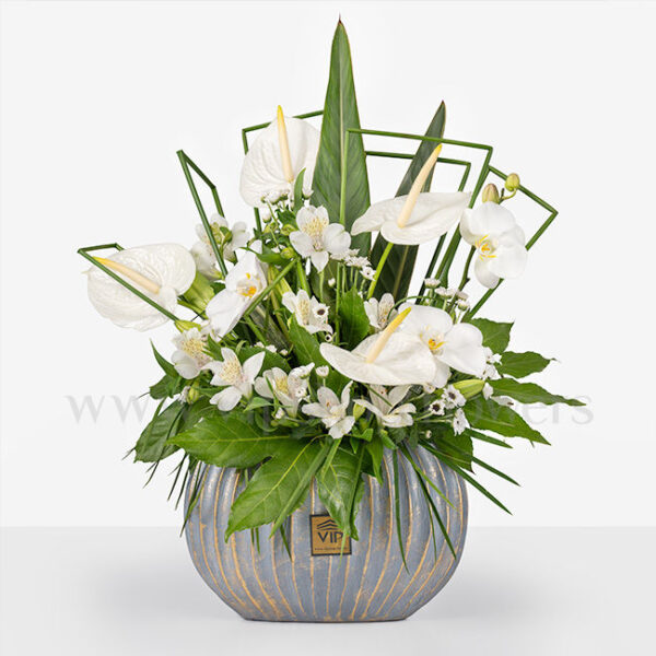 این سبد گل سفید با ترکیبی هنرمندانه از گلهایی طراحی شده که هر یک نمادی از آرامش و احترام هستند. چیدمان رسمی و باشکوه آن، این محصول را برای مراسم یادبود و ختم بسیار مناسب میسازد. اگر به دنبال خرید یک سبد گل ترحیم باکیفیت هستید، این مدل یکی از بهترین گزینههاست.