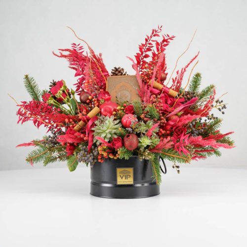جعبه گل رومیزی شب یلدا با شمع قرمز و ریسه